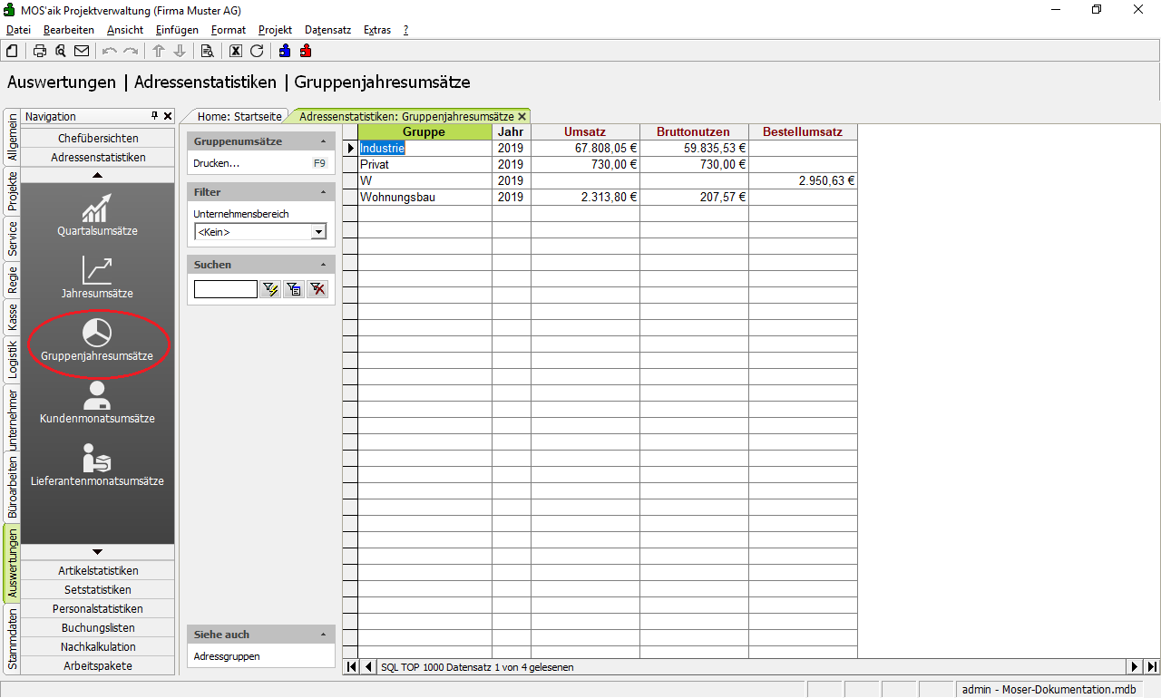 Gruppenjahresumsätze Sie haben die Möglichkeit, Ihre Adressen verschiedenen Gruppen zuzuordnen. So sehen Sie in der Adressgruppenjahresanalyse, in welchen Regionen Sie in welchen Jahren wie viel Umsatz und Bruttonutzen erzielt haben. |