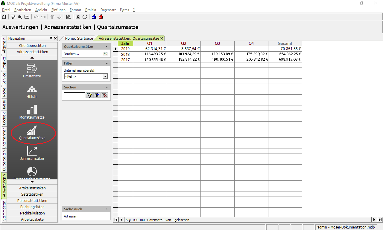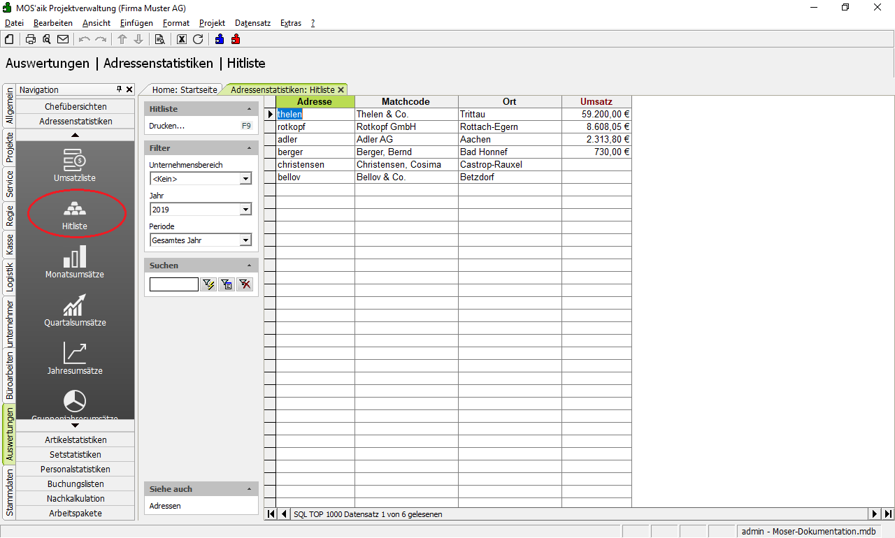 Hitliste Die Hitliste zeigt Ihnen die Umsatzzahlen zu Ihren Kundenadressen für einen ausgewählten Zeitraum (Gesamtes Jahr, Quartal, Monat) eines Jahres an. |