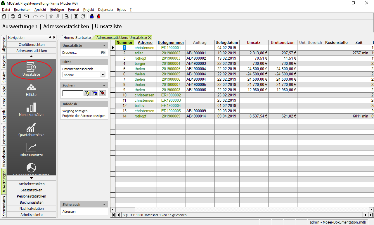 Umsatzliste Mit der Umsatzliste erhalten Sie einen vollständigen Überblick über die Umsätze und den Bruttonutzens zu Ihren Kundenadressen. Durch entsprechende Filterung und Sortierung erhalten Sie schnell die gewünschten Informationen. Eine weitergehende Beschreibung finden Sie unten. |