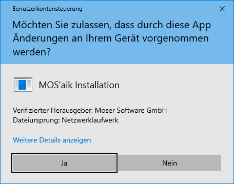 Benutzerkontensteuerung Bestätigen Sie den Start der MOS'aik Installation bzw. des Updates mit . Zusätzliche Informationen und Details zu ggf. abweichenden Darstellungen werden unter MOS'aik Schnelleinstieg - Setup-Berechtigungen erläutert. |
