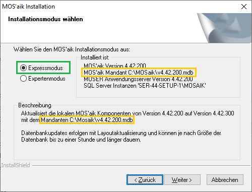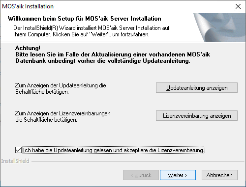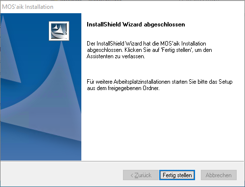 Installation ... Hinweise zum weiteren Verlauf des Updates im Expertenmodus finden Sie in den folgenden Abschnitten sowie im Themenbereich MOS'aik Schnelleinstieg. Für Standardupdates können die vorgegebenen Einstellungen aller Dialoge typischerweise übernommen werden. Beachten Sie nach Abschluss der Installation jedoch den Hinweis in Abschnitt 1.1.5, „Arbeitsplatzinstallation vorbereiten“. |