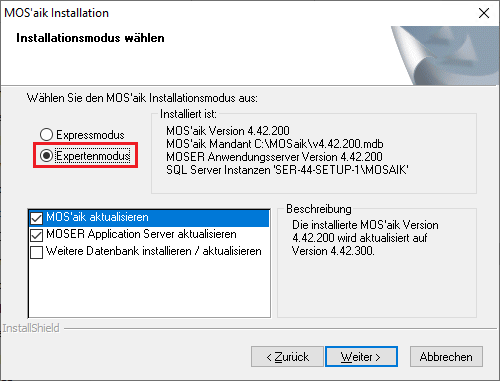 MOS'aik erfordert in Produktivumgebungen den Einsatz einer leistungsfähigen Datenbanksoftware. Der benötigte Microsoft SQL Server® wird dazu auf dem Moser Produkt-Installationsstick (USB) bereitgestellt (nicht enthalten auf CD/DVD). Falls bereits ein unterstützter SQL Server® verfügbar ist (siehe Systemvoraussetzungen), kann dieser grundsätzlich verwendet werden. Im Rahmen des Updates erfolgt jedoch eine Prüfung, ob es sich um eine von MOS'aik unterstützte Version handelt und der angemeldete Benutzer über die erforderliche Berechtigung db_owner auf dem SQL Server® verfügt (siehe auch Abschnitt 1.4.3, „Zugriffsrechte SQL-Server“). Für Einzelplatzsysteme, kann der SQL Server direkt auf dem Arbeitsplatzsystem installiert werden. Für einfache Testsysteme ohne Anwendungsserver und ohne die Web-Anwendung MOSER 'allround' ist ein SQL Server® nicht zwingend erforderlich. Updateschritte