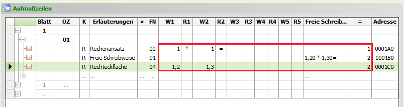 FN00, Dezimalstellen 2), freie Schreibweise (FN91, Dezimalstellen 2) und Rechteckformel (FN04, Dezimalstellen 3) eingegeben:Abbildung 2.55. Ausgangssituation