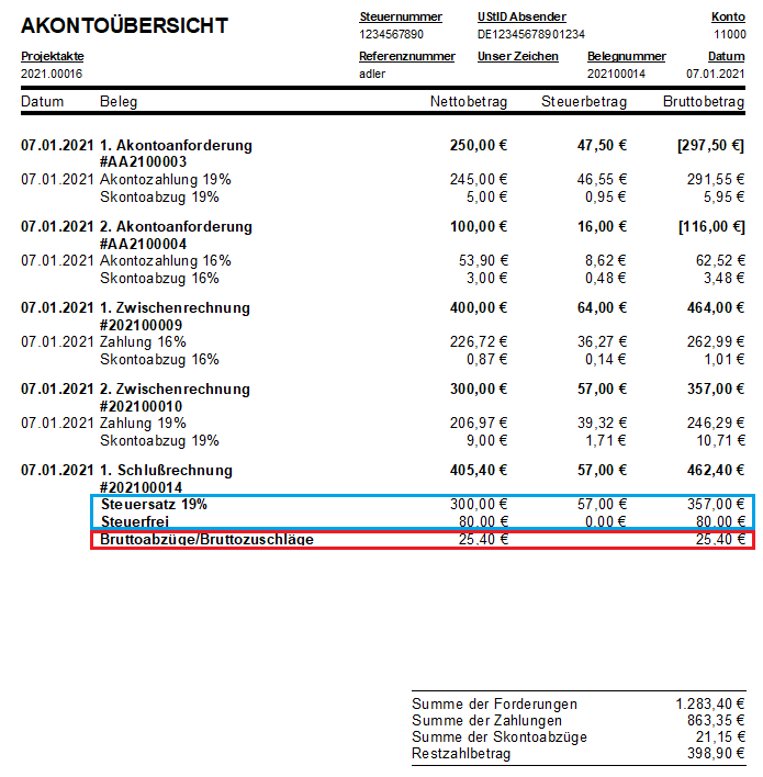 Die Akontoübersicht der Schlussrechnung enthält zusätzlich eine Zeile mit der Summe der Bruttoabzüge/Bruttozuschläge, wenn der Rechnungsbetrag aus mehreren Steuersätzen besteht (siehe rote Markierung):