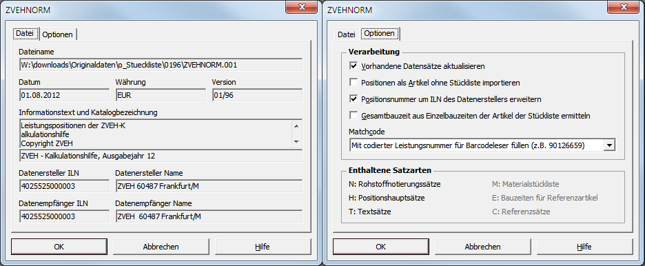 ELDANORM 01/96 und ZVEHNORM 01/96 importiert werden. In diesem Fall erhält man
