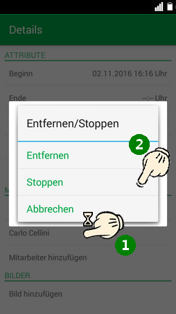 Halten Sie einen Finger auf den betreffenden Mitarbeiter bis der abgebildete Dialog erscheint und wählen Sie Stoppen: