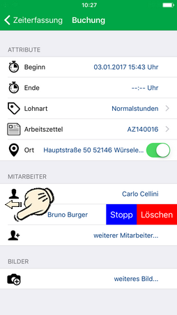 Mitarbeiter aus Kolonnenbuchung herauslöseniOS Android "Wischen" Sie den betreffenden Mitarbeiter mit einem Finger nach links und wählen Sie Stopp: