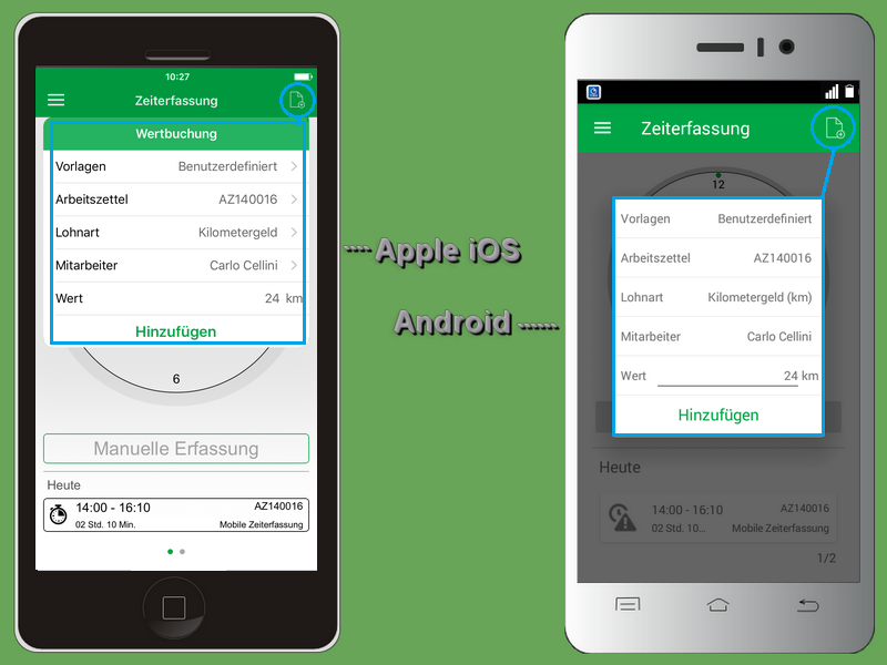 Wertbuchungen werden zunächst über das Menü aktiviert und die entsprechenden Lohnarten ausgewählt. Anschließend steht in der Zeiterfassungsansicht das Symbol am oberen rechten Rand zur Verfügung: