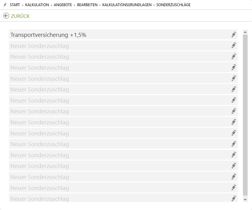 Diese Einstellung ist nur für die Kalkulationsart Zuschlagskalkulation verfügbar. Es handelt dabei um einen zusätzlichen Aufschlag auf den Einkaufspreis (wirkt auf alle Kalkulationsgruppen, wie z.B. Lohn oder Material, nicht jedoch auf Rohstoffe), mit dem Sie beispielsweise besondere zusätzliche Kosten prozentual erfassen können.