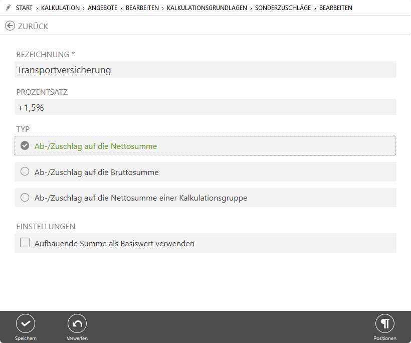 Die Eingabe von positiven Zuschlägen oder negativen Nachlässen kann wahlweise als prozentualer Wert oder Betrag in Euro eingegeben werden. Der Wert wird beim Druck offen ausgewiesen und wirkt auf alle Kalkulationsarten und Gliederungen ohne Rabattsperre.