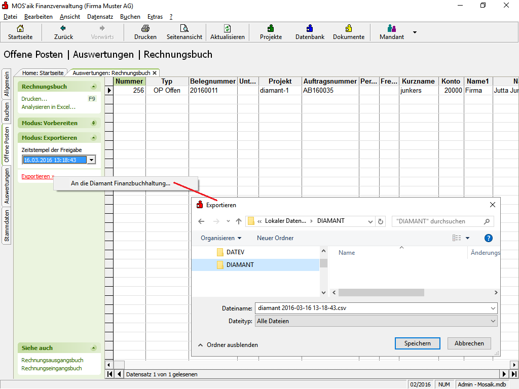 Der Export Ihrer Offenen Posten an die Diamant Finanzbuchhaltung erfolgt in zwei Schritten:
