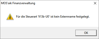 Sie können dazu in der Auswahlbox Zeitstempel der Freigabe die Auswahl einer Freigabe anzeigen und diese über die FunktionExportieren > An die Diamant Finanzbuchhaltung...in eine CSV-Datei exportieren.Steuerarten mit externem SchlüsselFür den Export an die Diamant Finanzbuchhaltung benötigen Sie zu jeder verwendeten Steuerart den entsprechenden Fremdschlüssel bzw. Steuerschlüssel. Wie dieser hinterlegt wird, wurde bereits im Abschnitt Kapitel 1, Einführung erläutert. Falls dieser fehlt, erfolgt eine Meldung wie folgt: