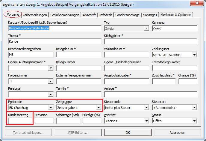 Hier finden Sie den Preiscode sowie die aus der Vorgangsvorlage übernommene Zeitgruppe: