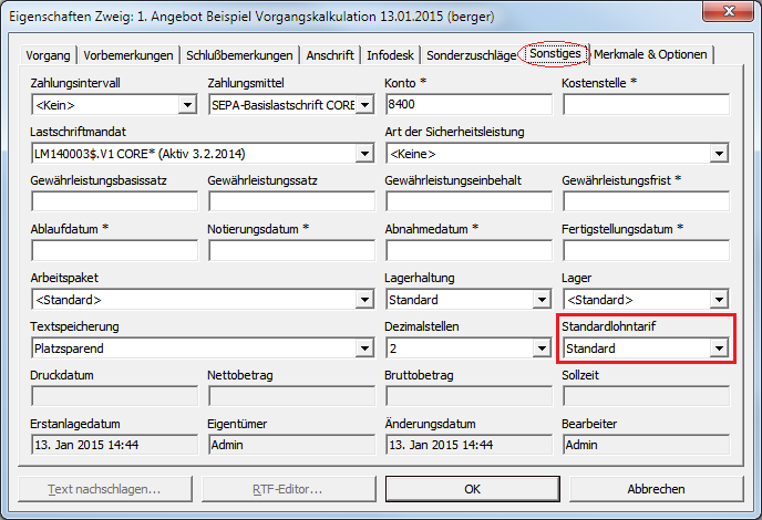 Der Standardlohntarif wird aus der Vorgangsvorlage übernommen. Ist bei einem Artikel oder Set oder einer untergeordneten Gliederung ein abweichender Lohntarif hinterlegt, so hat dieser eine höhere Priorität als der im Vorgang eingestellte und wird für die Kalkulation des betreffenden Artikels oder Sets oder der Gliederung verwendet.