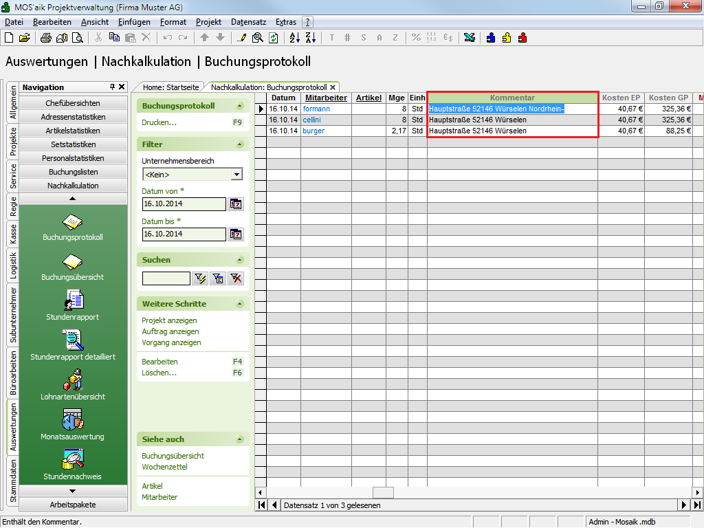 GPS-Koordinaten werden beim Import in MOS'aik als Kommentar zu den Datensätzen abgelegt. Sie finden die Informationen dann in den entsprechenden Tabellenarbeitsblättern (z.B. Buchungsprotokoll) in der Spalte Kommentar:
