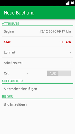 Liegt das Arbeitsende beim Verlassen der Ansicht nicht vor, so wird das Feld in roter Schrift hervorgehoben (s. Abbildung). Nach nochmaligem Betätigen der Zurück-Taste wird die begonnene Buchung verworfen und die Anwendung kehrt in die Zeiterfassungsansicht zurück.