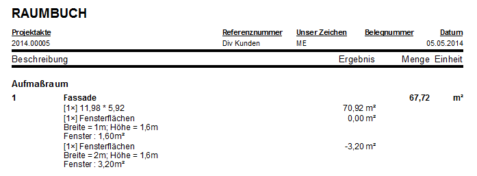 Das Raumbuch zeigt die Details der Massenberechnung:
