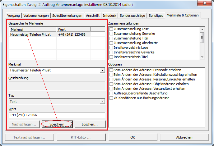 Die erweiterten Merkmale eines Projekts bzw. Vorgangs können direkt in den Projekt- bzw. Vorgangseigenschaften auf der Registerkarte Merkmale & Optionen bearbeitet werden.