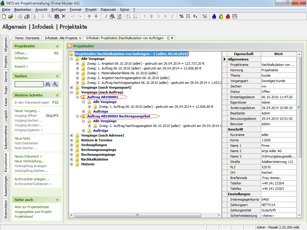 Bitte beachten Sie außerdem, dass das Kennzeichen für die Nachkalkulation nicht aus den Kopfdaten des Projekts/Ordners zum Vorgang bestimmt wird, sondern aus dem Projekt/Ordner des durch die Auftragsnummer spezifizierten Kostenträgers!