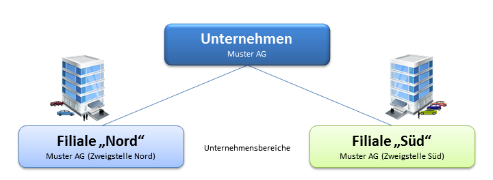 Über die Unternehmensbereiche können für einen Mandanten untergeordnete Bereiche wie Niederlassungen, örtlich getrennte Zweigstellen, Filialen, Abteilungen usw. mit den zugehörigen Mitarbeitern eingerichtet werden.