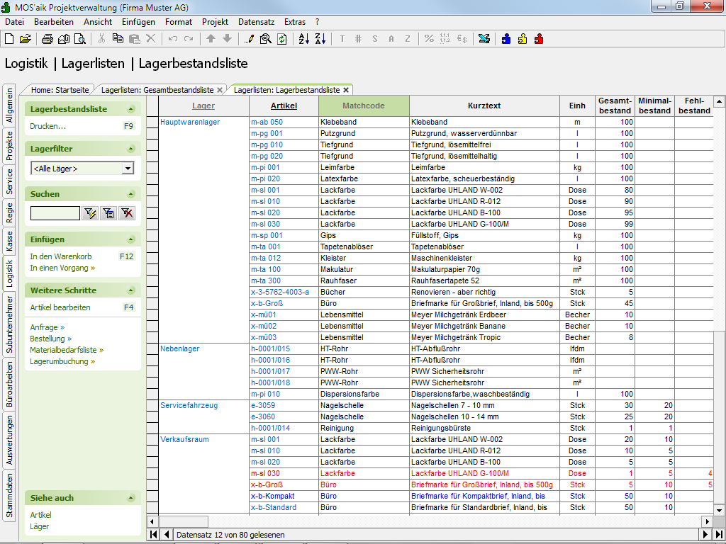 Minimalbestandvon Artikeln mit einem roten Farbfilter angezeigt (siehe Abschnitt 2.3, „Lagerüberwachung“).