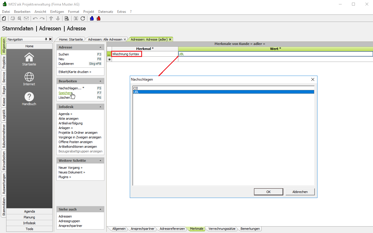 Wechseln Sie im Arbeitsblatt Adresse des Kunden auf die Registerkarte Merkmale, fügen Sie das Merkmal XRechnung Syntax ein, weisen diesem mit F5 den Wert