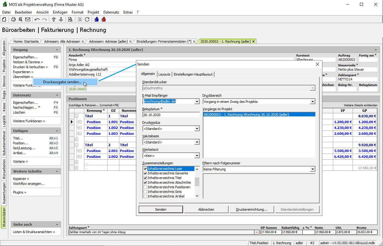 Vorgang > Übermitteln >> Druckausgabe senden ...bzw. das Menü auf, um den Dialog zum Buchen und Senden des Vorgangs zu öffnen:Abbildung 3.4. Druckausgabe senden