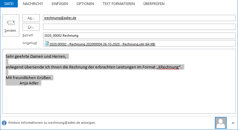 Ergänzen Sie hier Ihr Anschreiben und passen Sie ggf. die Empfängeradresse an.Senden Sie anschließend die E-Mail mit der angehängten XRechnung an den Empfänger.