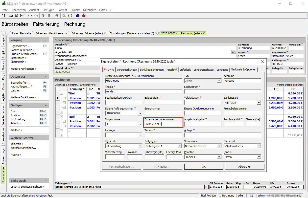 Geben Sie auf der Registerkarte Vorgang im Feld Externe Vergabenummer die von Ihrem Auftraggeber vergebene "Leitweg-ID" ein. Diese Nummer erhalten Sie von Ihrem Auftraggeber und übergeben diese mit der XRechnung an den Auftraggeber zurück. Die Kennung dient der korrekten Zuordnung und Weiterverarbeitung Ihrer Rechnung beim Auftraggeber. Die Angabe ist verpflichtend und die Erstellung der XRechnung wird bei fehlender Angabe abgelehnt.