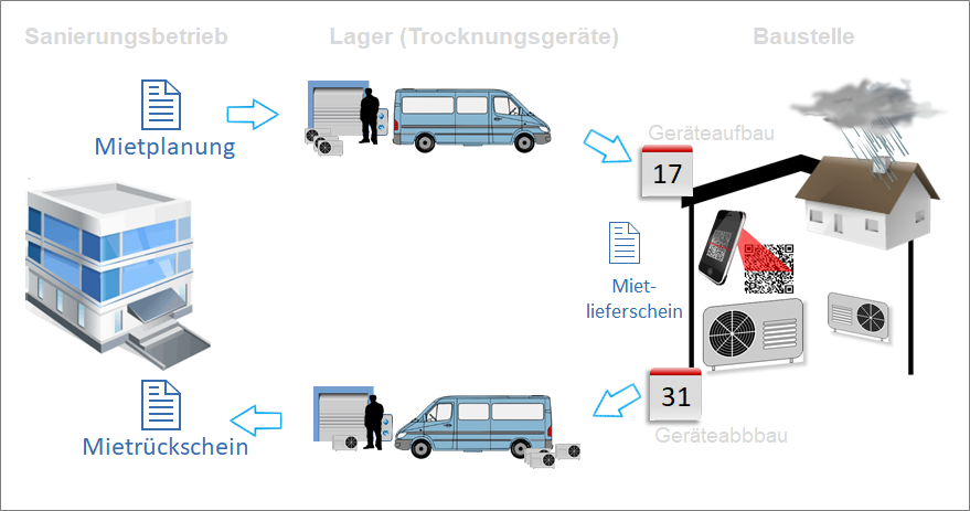 Mit der mobilen Anwendung Moser Mietgeräte (Android) ist es möglich, im Rahmen des Schadenmanagement die Verbräuche und Laufzeiten von Mietgeräten digital zu erfassen und die Daten direkt an eine MOS'aik Schadenakte zu übermitteln. So kann z.B. der Einsatz von Trocknungsgeräten zur Begrenzung von Wohngebäudeschäden durch die Sanierungsbranche geplant, überwacht und abgerechnet werden.