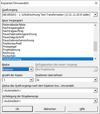 Beispiel: Beim Kopieren eines Nachtragsauftrags in eine Schlussrechnung werden alle zum Quellauftrag gehörenden Nachträge und Zwischenrechnungen ohne Rückfrage verbucht und abgerechnet.