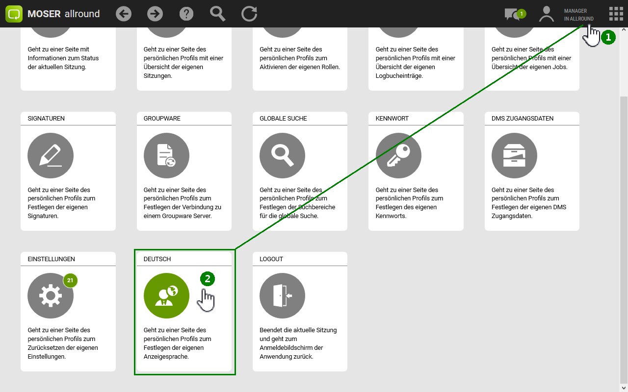 Über den Bereich (siehe auch Kapitel 5, Mein Profil) bzw. über das Symbol für das Benutzerprofil in der Navigationsleiste kann die Sprache der Programmoberfläche für den aktuellen Benutzer festgelegt werden (siehe Kapitel 5, Mein Profil). Berechtigungen