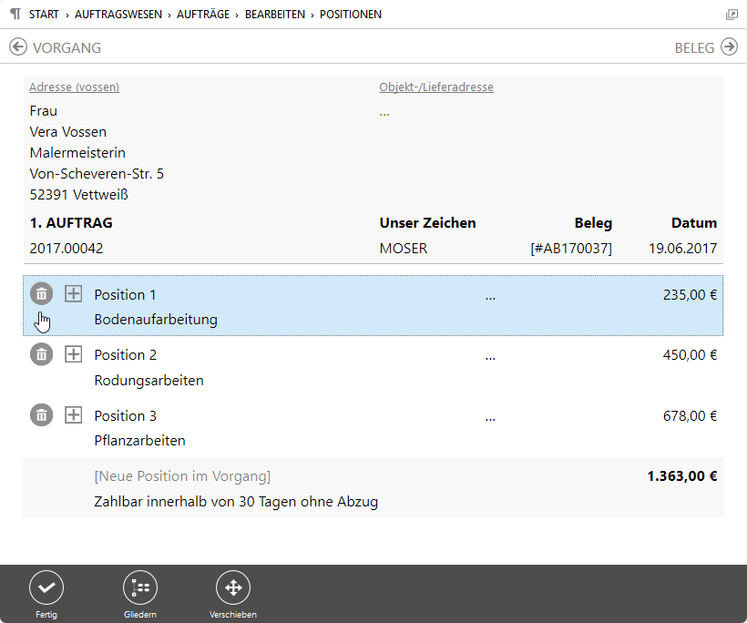 Aus der Positionsansicht heraus können Vorgangspositionen über die Funktion Bearbeiten verschoben werden. Um beispielsweise die Position "Bodenaufbereitung" hinter die Position "Rodungsarbeiten" zu verschieben, markieren Sie die zu verschiebende Position. |