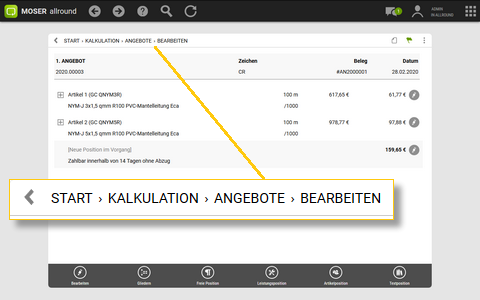 Die sogenannte "Brotkrümel" oder auch "Breadcrumb"-Navigation in der Titelleiste zeigt Ihnen an, in welchem Arbeitsbereich bzw. welcher App Sie sich gerade befinden. Dazu werden übergeordnete Ebenen angezeigt und können direkt ausgewählt werden, um auf die entsprechende Programmseite zu gelangen. Der Name entspringt dem Märchen "Hänsel & Gretel", die Ihren Weg aus dem Wald zurück nach Hause mithilfe gestreuter Brotkrumen gefunden haben. Dieses und andere Komponenten machen MOSER 'allround' zu einer besonders übersichtlichen und einfachen Anwendung. |