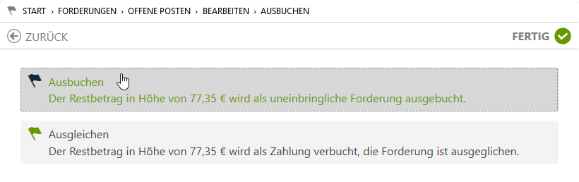 Um einen OP als "vollständig bezahlt" zu verbuchen, öffnen Sie diesen über das Symbol , rufen die Funktion Ausbuchen auf und wählen dann die Option Ausgleichen an: