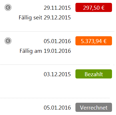 Durch Auswahl der Schaltfläche Alle anzeigen werden OPs mit beliebigem Status angezeigt, wogegen mit Offene anzeigen nur die unbeglichenen bzw. mit Fällige anzeigen nur OPs aufgeführt werden, deren Zahlungsfrist überschritten wurde. Das Fälligkeitsdatum von OPs wird im FAQ weiter erläutert. Mögliche OP-Zustände werden folgendermaßen dargestellt: