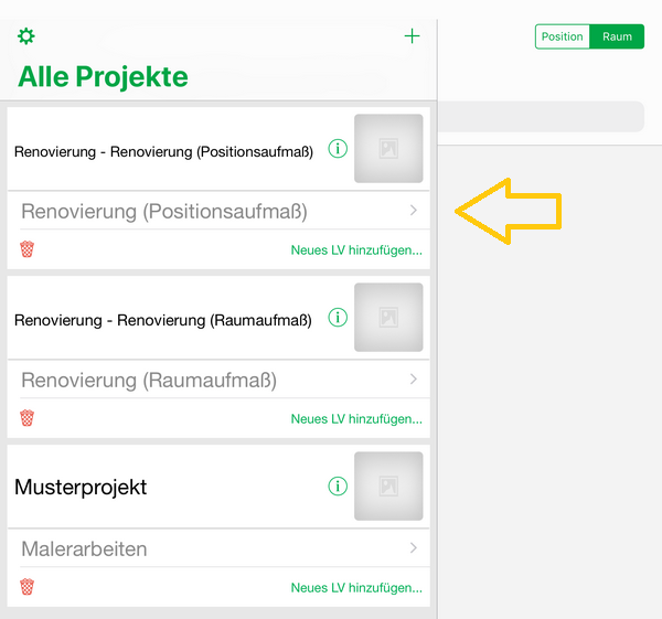 Die Anwendung Moser Aufmaß wird gestartet und Ihr Leistungsverzeichnis in der Projektliste aufgeführt: Auf der Startseite erscheint das neue Leistungsverzeichnis (LV) in der Liste Alle Projekte. Zum Projekt gehörige Leistungsverzeichnisse werden mit dem