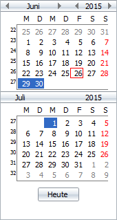 Zur Auswahl des Zeitraums für die Anzeige der Mitarbeiterdisposition stehen zwei Monats-Kalender zur Verfügung. Im oberen Kalender können die Monate sowie das Jahr gewechselt werden. Der untere Kalender zeigt automatisch immer den Folgemonat an. Die möglichen Ansichten (Tagesansicht, Zeitachsenansicht) sowie die Bedienung des Kalenders sind nachfolgend erläutert. |