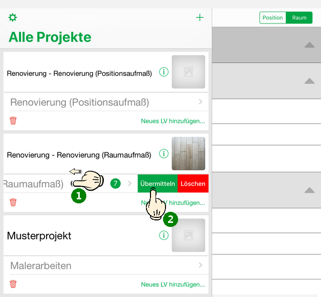 Um ein fertiggestelltes Aufmaß an MOS'aik zurückzusenden, ziehen Sie das gewünschte Leistungsverzeichnis mit einem Finger nach links (1) und wählen die Schaltfläche "Übermitteln" (2): |