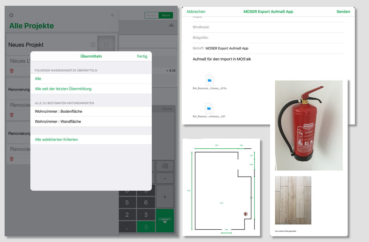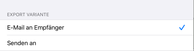 Der Export erfolgt wahlweise per E-Mail oder durch Auswahl einer geeigneten App über einen Senden an-Dialog: |