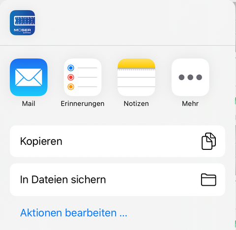 Bei Auswahl des Senden an-Dialogs wird Ihnen eine Auswahl verfügbarer Apps angeboten, an die die gewählten Massenansätze übergeben werden können. Auf diese Weise können die Daten nicht nur per E-Mail versendet, sondern beispielsweise auch auf einem Cloud-Speicher (z.B. "Dropbox") abgelegt, in die Zwischenablage kopiert oder an eine sonstige App übergeben werden. |