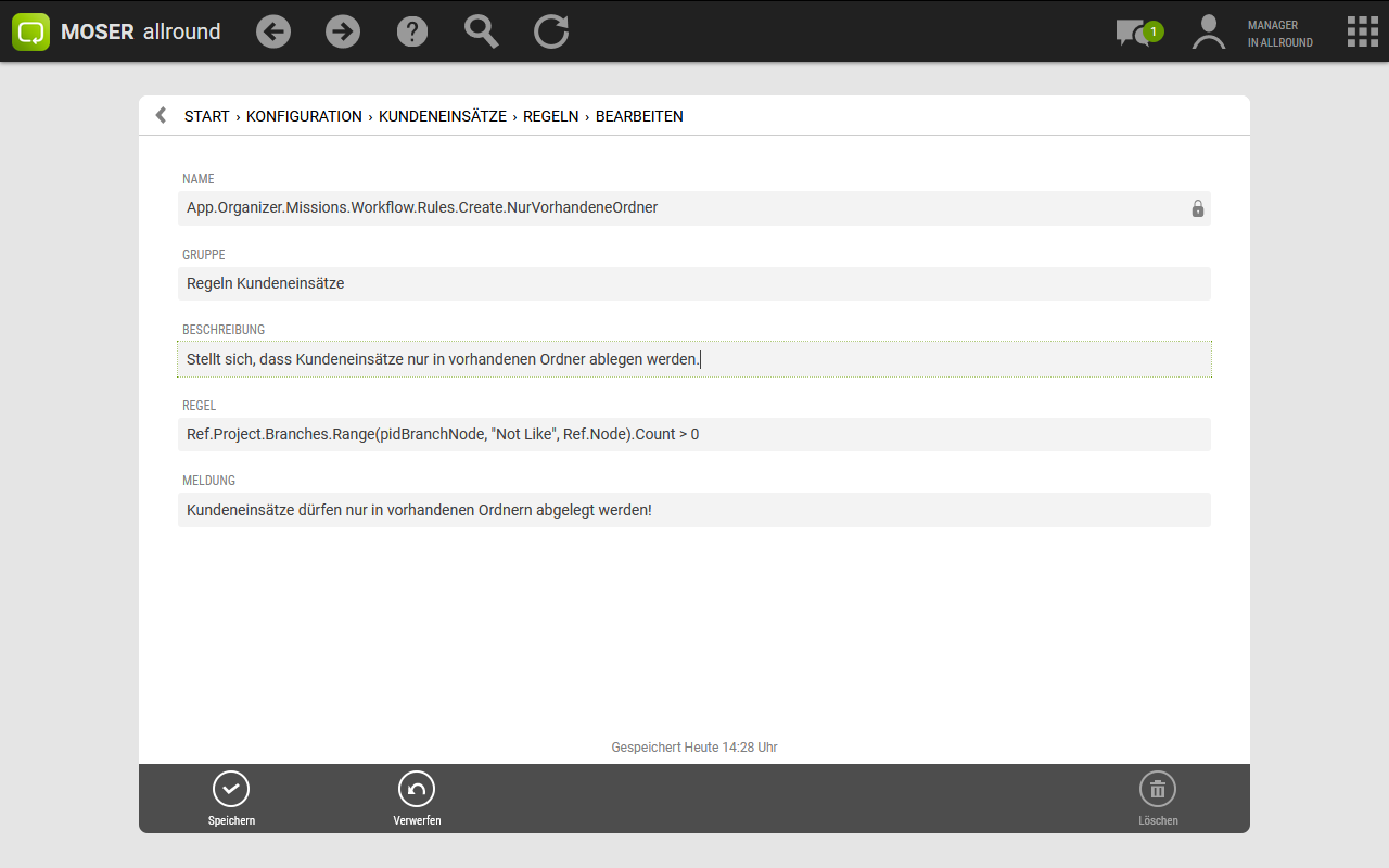 Der Bezeichner darf keine Leer- oder Sonderzeichen enthalten und dient nur der internen Datenablage. Die Beschreibung wird nach der Speicherung der Regel der oben aufgeführten Liste definierter Regeln zugefügt. Die Meldung wird in der Meldungsleiste ausgegeben, wenn die definierte Regel nicht zutrifft. Diese muss dazu einen boolschen Ausdruck enthalten, der sich typischerweise aus Ausdrücken des Moser Objektkatalogs (Objektkatalogs) zusammensetzt.Wenden Sie sich für weitere Unterstützung an den Moser Produktservice oder Ihren Moser Kundenberater (Kontakt).