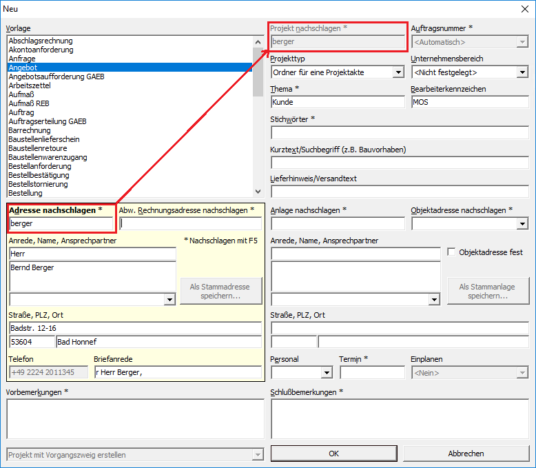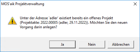 Die neu angelegte Projektakte erhält als Projektnamen (Projekt) denKurznamender Adresse.Die Speicherung neuer Vorgänge mit derselben