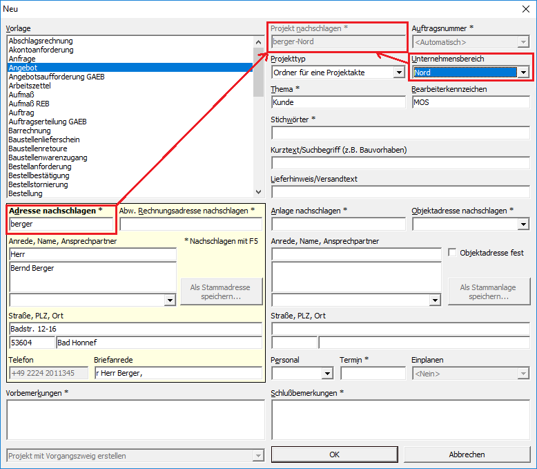 Die neu angelegte Projektakte erhält als Projektnamen (Projekt) denKurznamender Adresse und als Ergänzung den ausgewähltenUnternehmensbereich.Die Speicherung neuer Vorgänge mit derselben Adresse und demselben Unternehmensbereich erfolgt dann automatisch in diesem Projekt/Ordner.