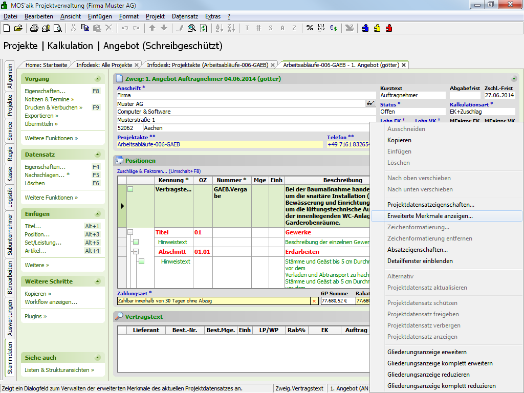 Zum Aufruf der erweiterten Merkmale einer Position aus der Vorgangsansicht stellen Sie auf die Zeile einer Position ein und wählen mit der rechten Maustaste im Kontextmenü die Funktion :