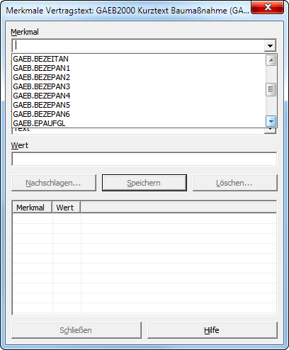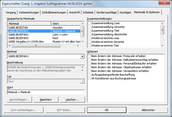 Eigenschaften ...des Vorgangs und anschließend die Registerkarte Merkmale & Optionen.Für GAEB Projekte finden Sie die verfügbaren Merkmale in der linken oberen Bildhälfte (Bereich Merkmal). In der linken oberen Bildhälfte finden Sie die im Vorgang verwendeten Merkmale mit ihren Werten: