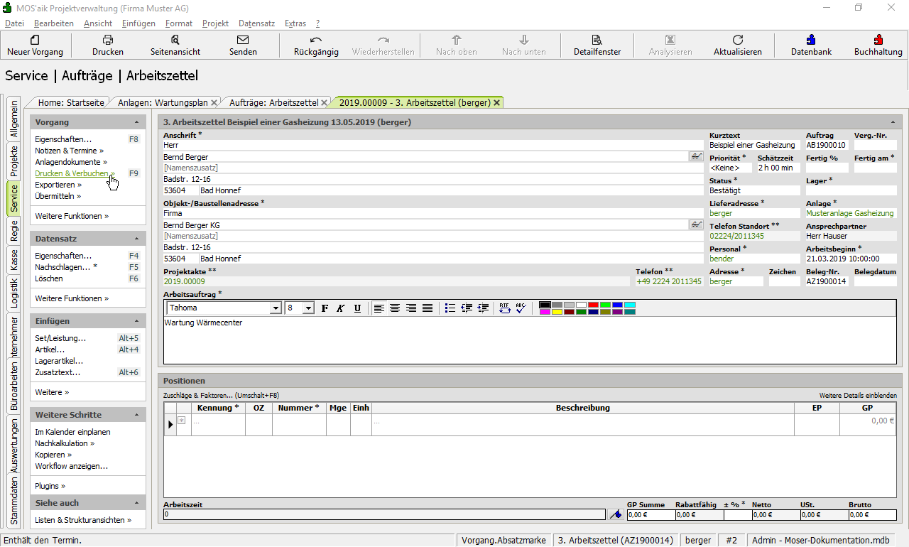 Beim Druck eines Arbeitszettels wird auf dem Deckblatt im Bereich Rechnungsadresse die Postanschrift der Rechnungsadresse für die Ermittlung der Straße und des Orts verwendet, auch wenn für die Adresse in den Stammdaten die Postfachanschrift mit Postfach hinterlegt wurde. Dem Monteur stehen damit auf dem Arbeitszettel alle wichtigen Adressdaten zur Verfügung.