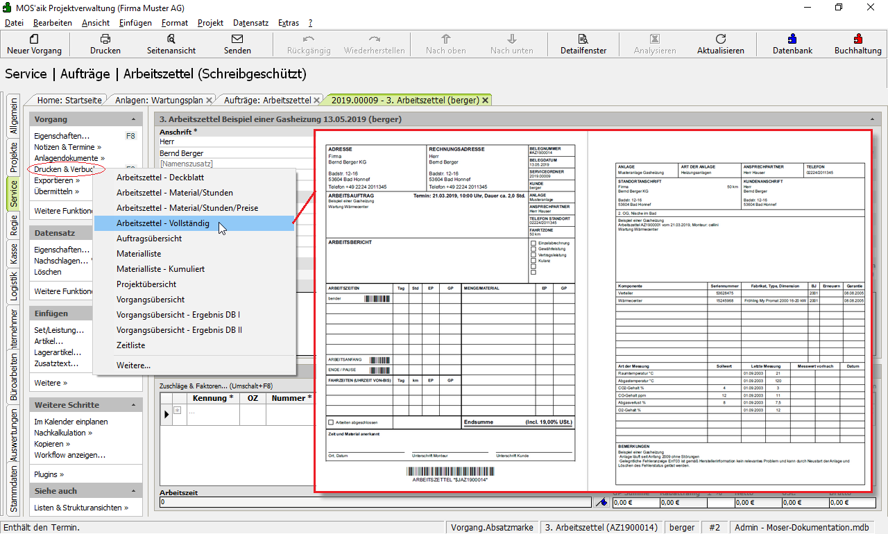 Aus der Auflistung der Arbeitszettel Service | Aufträge | Arbeitszettel bzw.