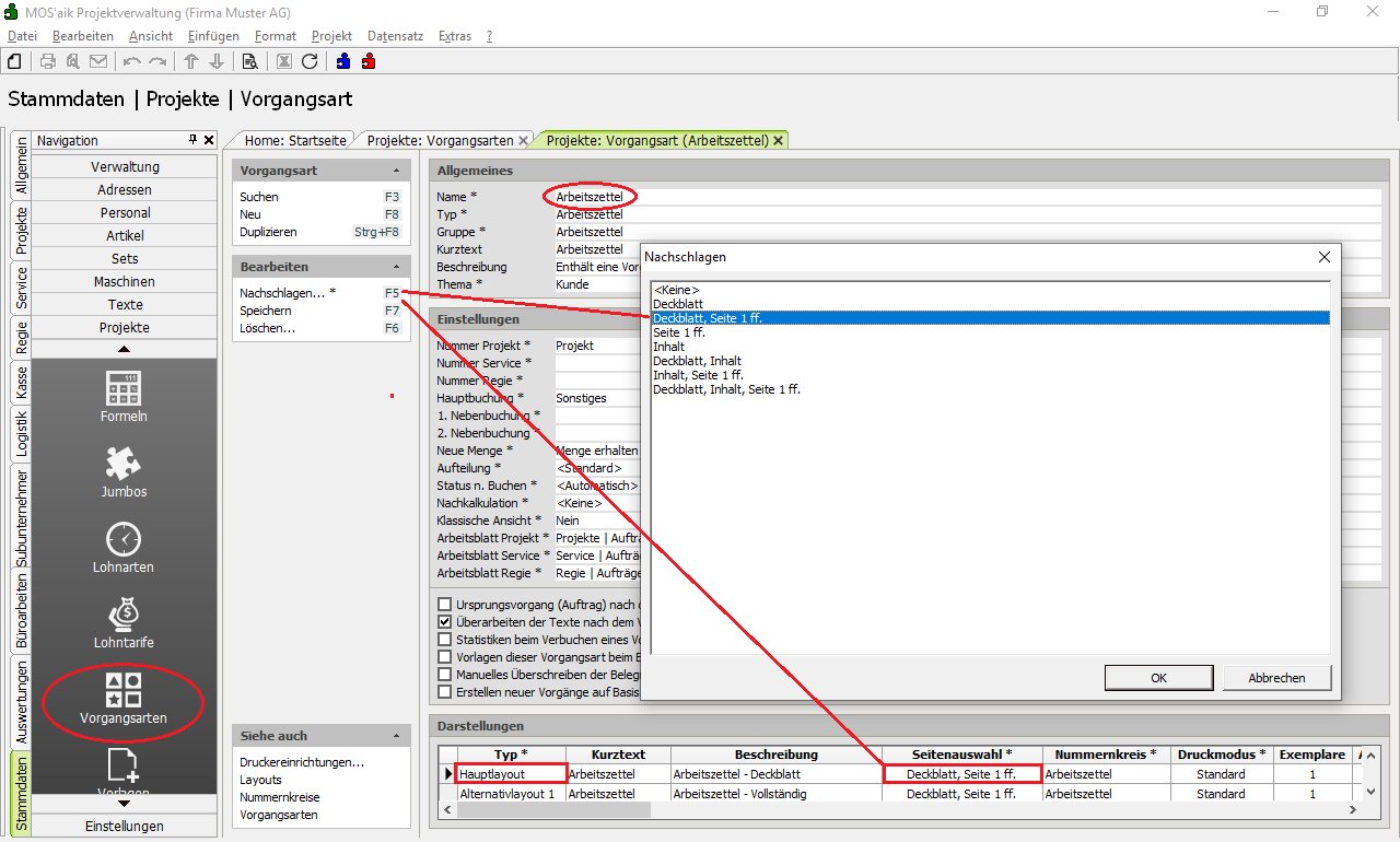 Arbeitszettel grundsätzlich vollständig drucken: Sollen die Arbeitszettel grundsätzlich vollständig gedruckt werden, muss die Seitenauswahl der Vorgangsart Arbeitszettel für das Hauptlayout in Deckblatt, Seite 1 ff. oder Deckblatt, Inhalt, Seite 1 ff. geändert werden: |