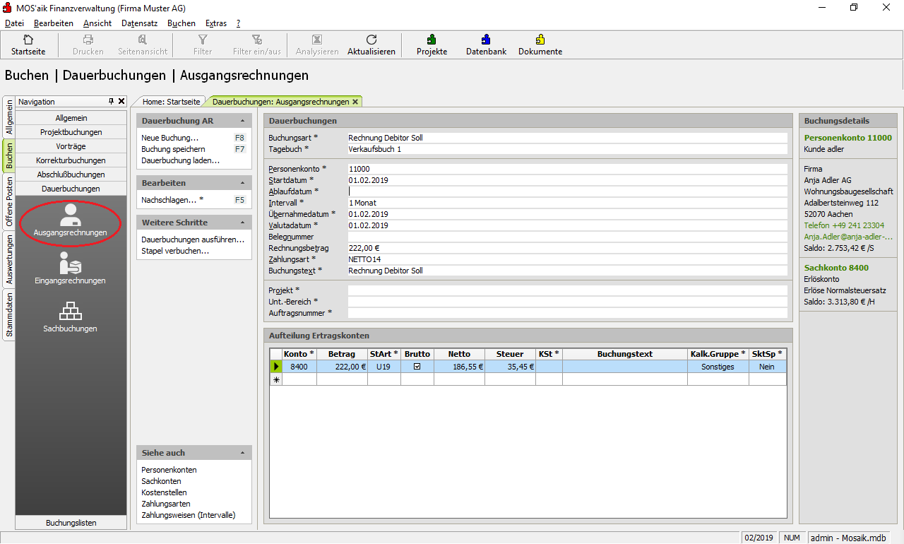 Ausgangsrechnungen Erfassung periodisch wiederkehrender Ausgangsrechnungen mit einem festen Betrag. |